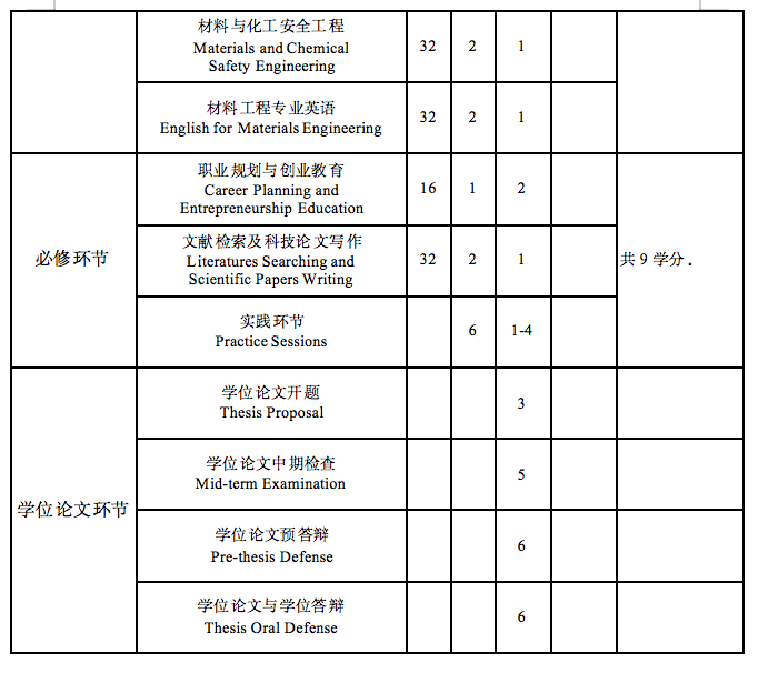 必修环节:文献检索及科技论文写作2学分;职业规划与创业教育1学分;实践环节(包含教学实践、学术实践)6学分;共9学分。