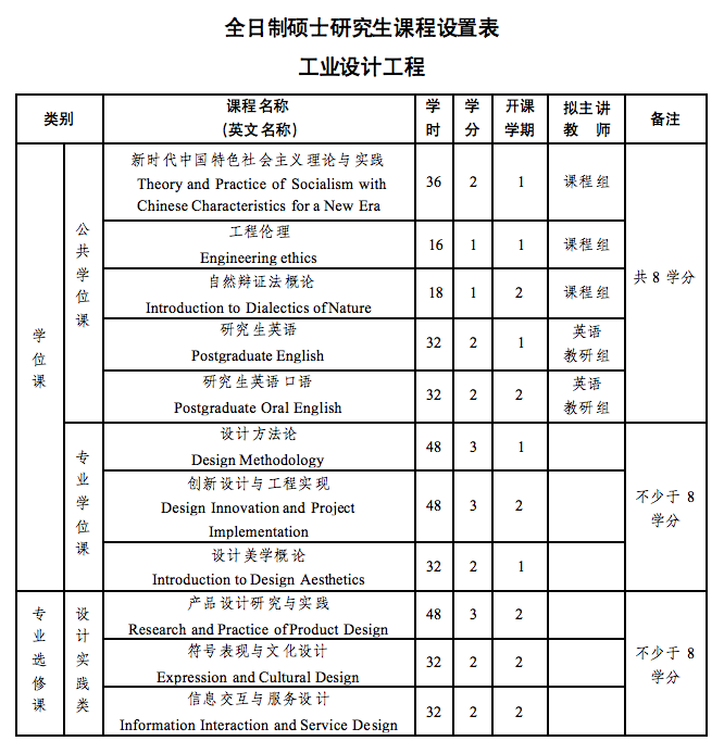 全日制工业设计工程领域硕士研究生课程学习实行学分制,最低课程学分要求为33学分,具体分布如下:公共学位课:共8学分;专业学位课:至少8学分;专业选修课:至少8学分;必修环节:9学分;课程设置如下表所示。(对于跨学科考入或同等学力考入的研究生,应当至少补修2门与本学位点相关的本科专业基础课或专业骨干课程,并进行考核另计学分,但不能替代以上各项规定的学分。)