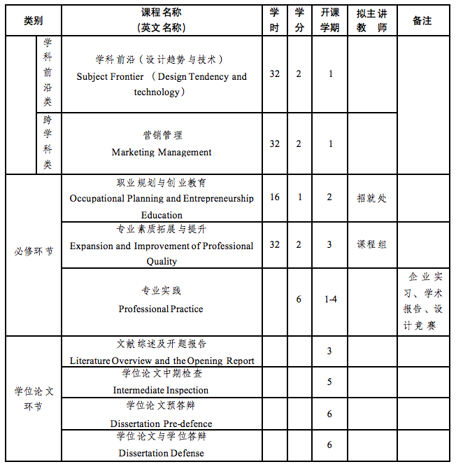 2.入学第1~2或3学期,主要进行学位公共课、专业基础课、专业必修课和选修课的学习。课程学习期间,在导师指导下围绕研究方向和相关设计实践广泛阅读文献资料,撰写文献综述报告。