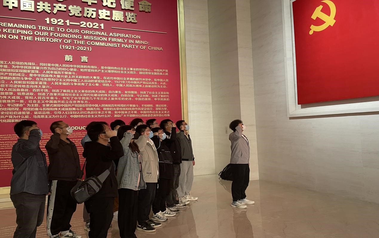 当大家进入中国共产党历史展览馆时,映入眼帘的是一面巨大的党旗,当看到党旗的那一刻,“请党放心,强国有我”的誓言不禁在心中响起;同学们深深意识到,作为当代青年,应该为中华民族伟大复兴奉献自己的一份力量。同学们在党旗前重温了入党誓词,坚定的誓言在展厅回荡。