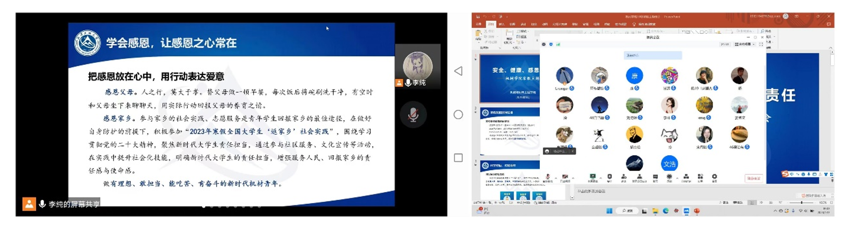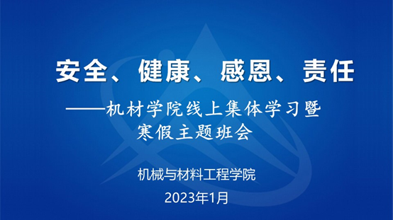 面向全体本科生、研究生组织各班开展了以“安全、健康、感恩、责任”为主题的线上集体学习暨寒假主题班会和研究生组会,确保寒假期间学生工作开启“不断线、常更新”模式。