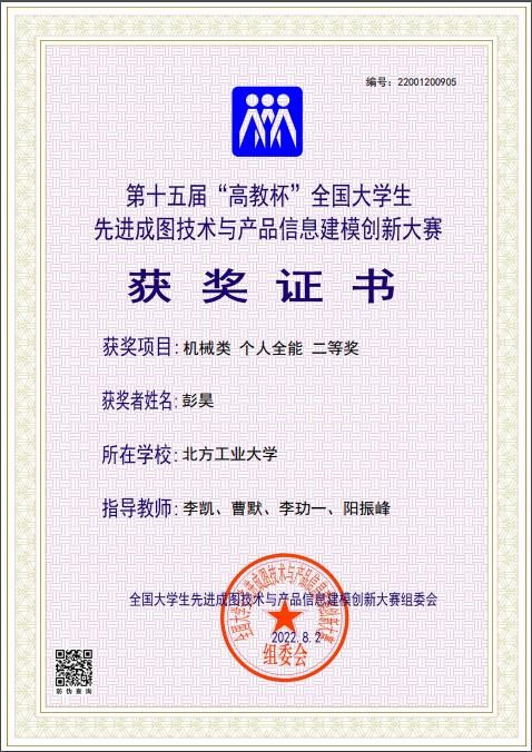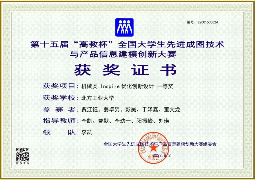 2022年7月,第15届“高教杯”全国大学生先进成图技术与产品信息建模创新大赛圆满结束,我校学生在大赛中取得良好成绩,贾江钰、姜卓男、彭昊、于泽嘉、董文龙等5位同学合作斩获了机械类Inspire优化创新设计一等奖,彭昊同学获得了机械类个人全能二等奖,此外,其他同学还获得了9项三等奖。