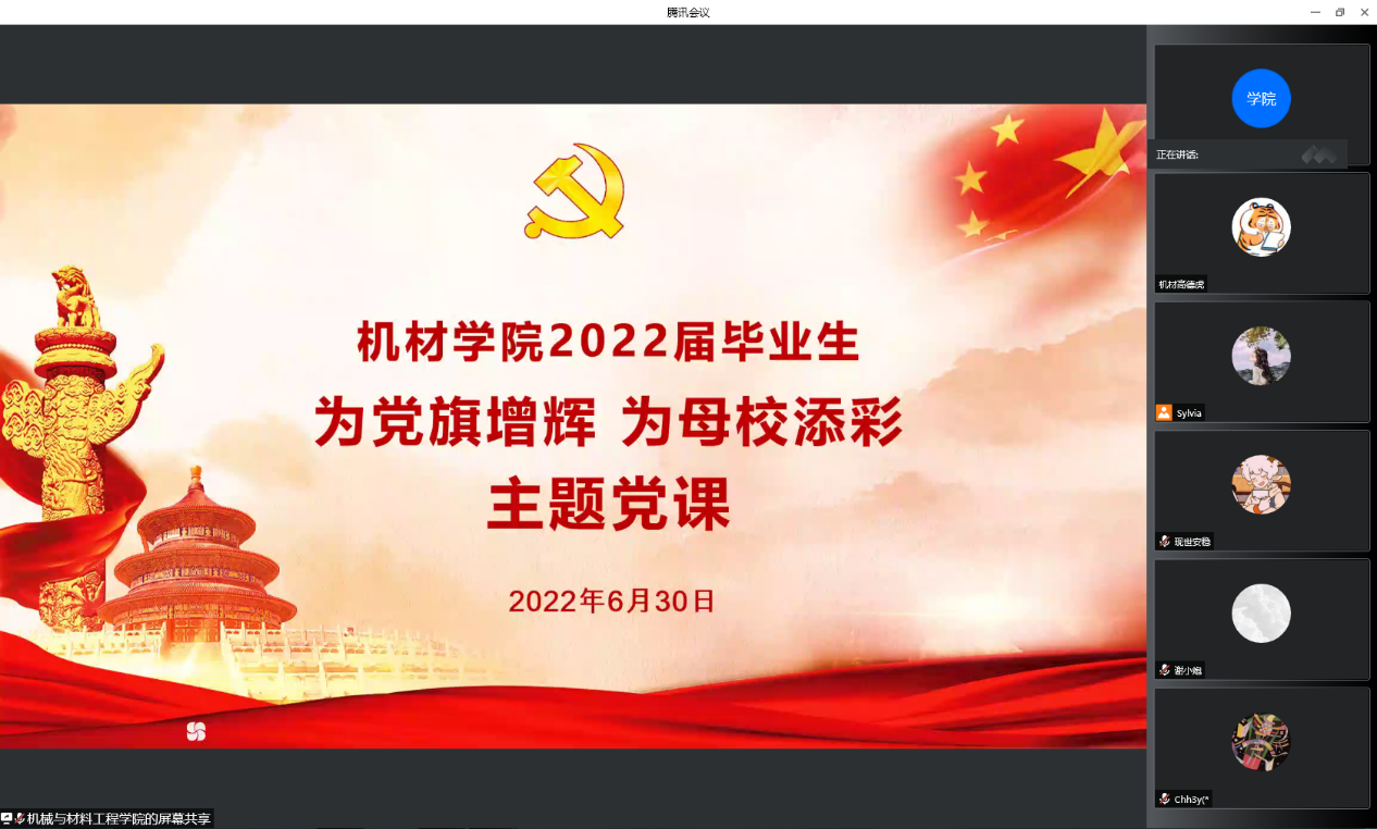 召开“为党旗增辉 为母校添彩”主题党课,院班子集体为2022届毕业生讲党课。全体毕业生党员参加了党课学习。