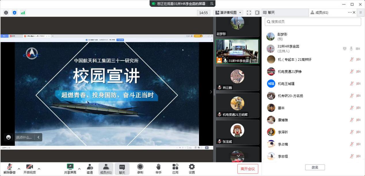 航天科工三院三十一所是我院在访企拓岗促就业专项行动中主推的优质就业单位。该所招聘工作岗位与我院所设专业契合度高。我院已有多名2022届本科毕业生成功入职三十一所,助力中国航天梦。10月28日,在三十一所的专场线上宣讲会中,企业人力负责人围绕研究所发展状况、招聘岗位、薪资待遇及培养晋升等学生关注的问题给予了详细介绍。岗位负责人对岗位职责、工作性质与内容进行了深入讲解,在线学生积极互动、现场气氛热烈。