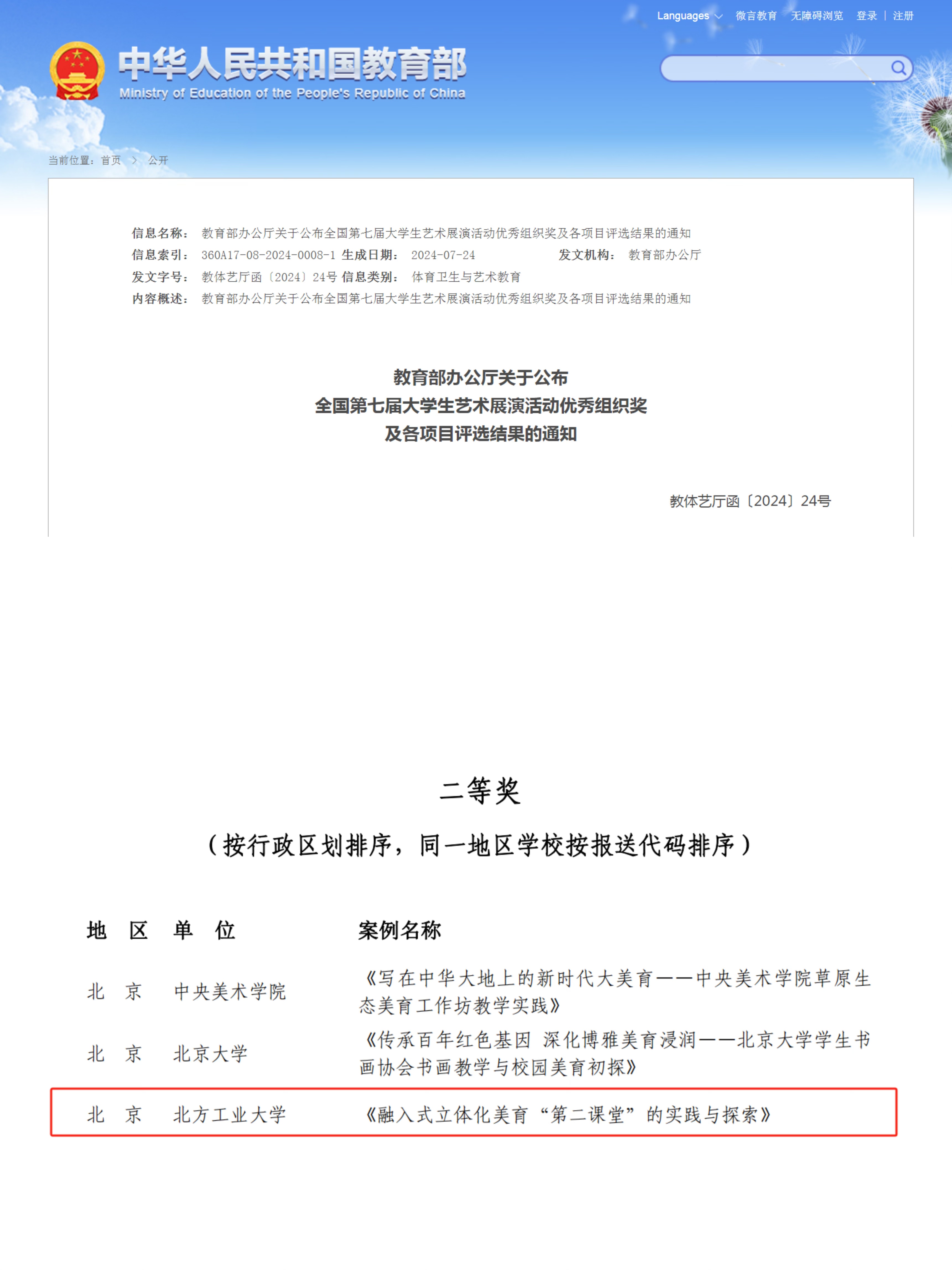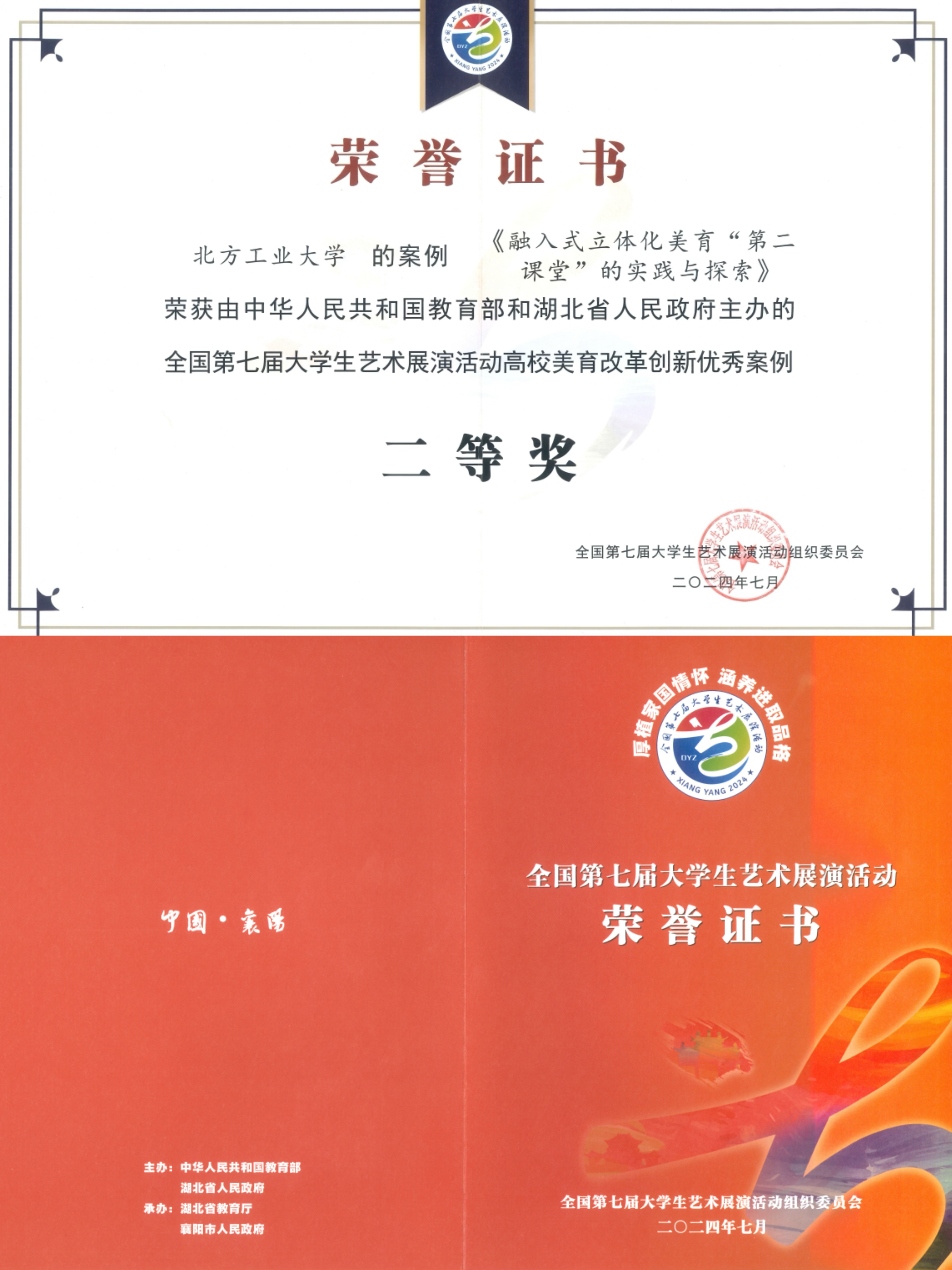 近日,学校荣获全国第七届大学生艺术展演活动组织委员会颁发的荣誉证书,我校申报的《融入式立体化美育“第二课堂”的实践与探索》荣获由国家教育部和湖北省人民政府主办的全国第七届大学生艺术展演活动高校美育改革创新优秀案例二等奖。