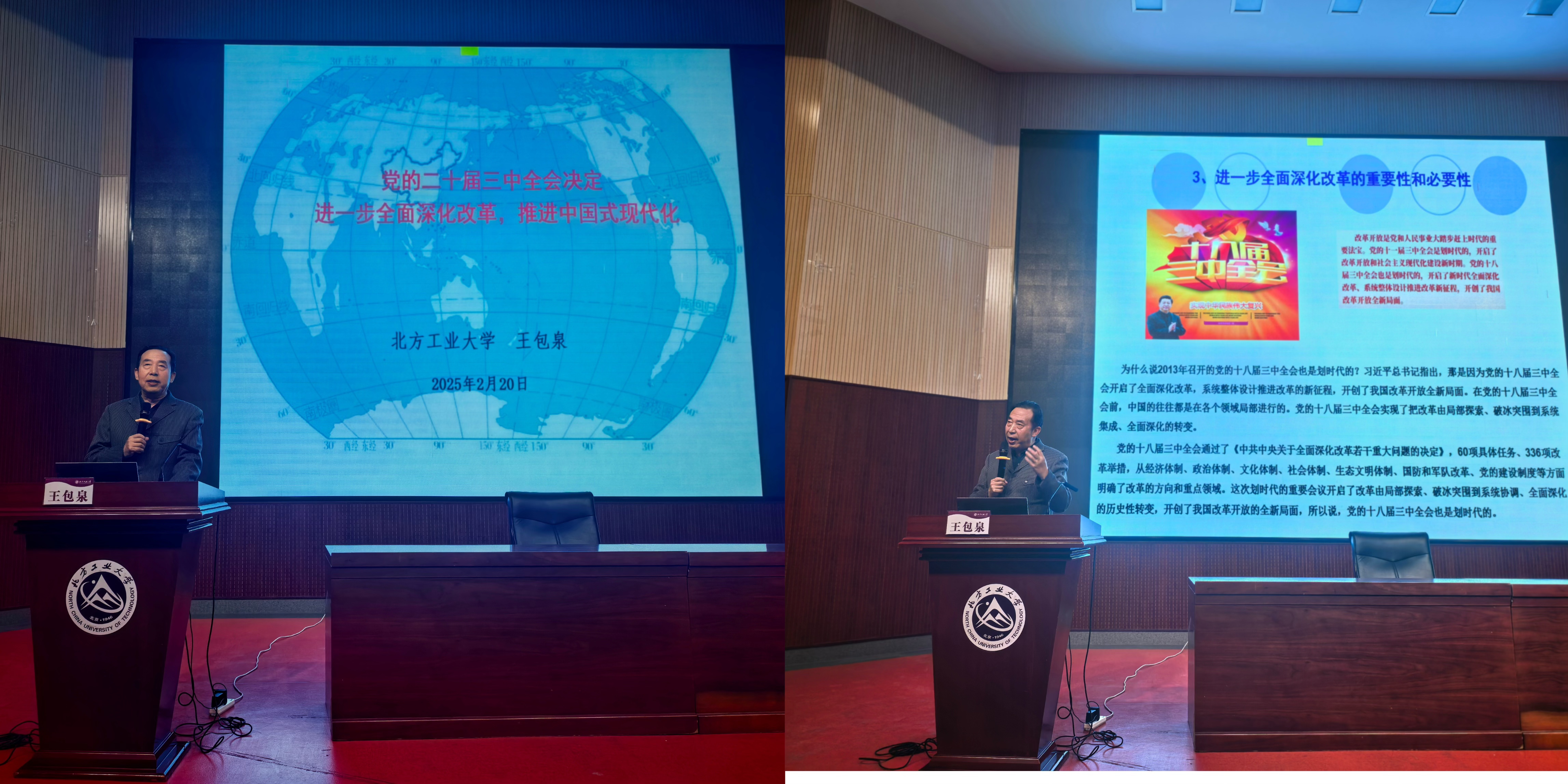 于2025年2月20日在文化会堂举办专题学习报告会,特邀我校离退休党委委员、思政教育资深专家王包泉以“党的二十届三中全会决定——进一步全面深化改革,推进中国式现代化”为题,为全体教职员工做党的二十届三中全会精神学习报告。