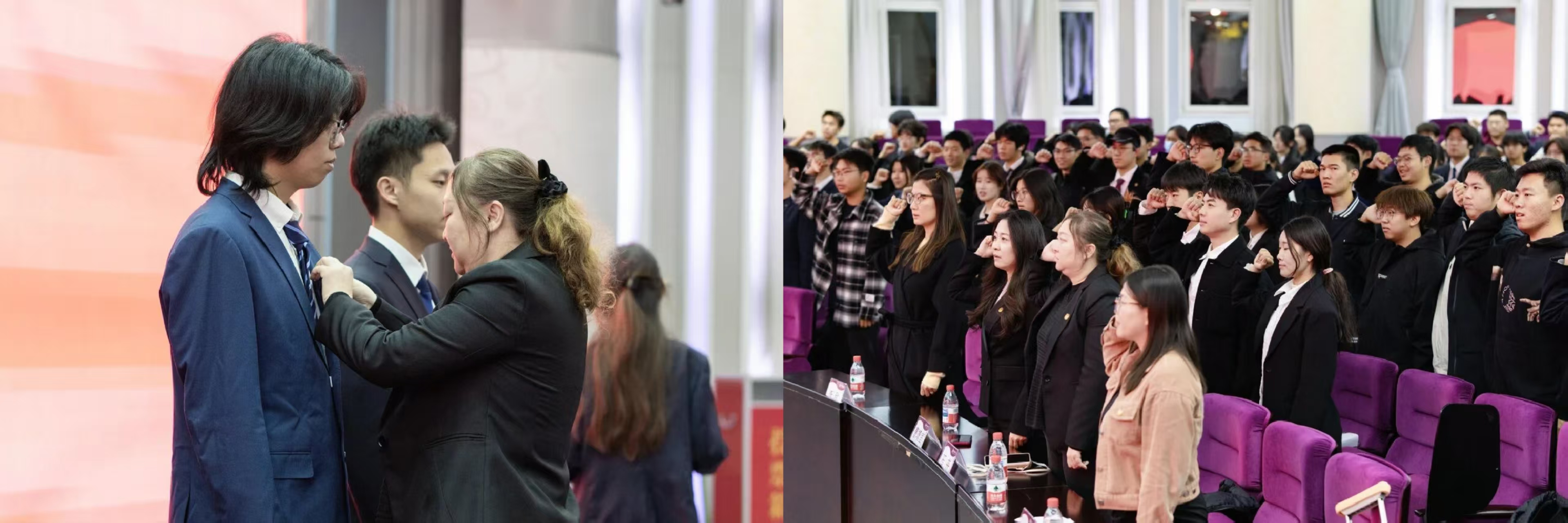 学院党委副书记石卉为本年度新发展团员代表颁发了团章和团徽,院团委副书记刘佳怡带领全体新老团员重温了入团誓词。