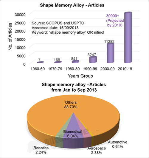 利用Scopes和美国专利商标局搜索引擎搜索形状记忆合金及其它记忆材料获得的文章分析结果表明,到2019年形状记忆合金及记忆材料相关领域论文数将超过30000篇。生物医药领域的专利占比在6%左右。