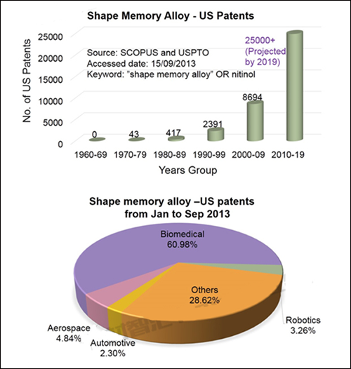 利用Scopes和美国专利商标局搜索引擎搜索形状记忆合金及其它记忆材料获得专利分析结果表明,到2019年形状记忆合金及记忆材料相关领域US专利数将超过25000件,生物医药领域的专利占比接近60%。