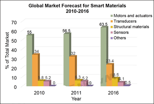 其中最大市场是驱动器和电机,2010年的销售额为10.8亿美元(占总市场份额的55%),到2016年市场份额将会达到25.4亿美元(约64%的市场份额),而在结构领域的应用份额将会提高到8.5%。