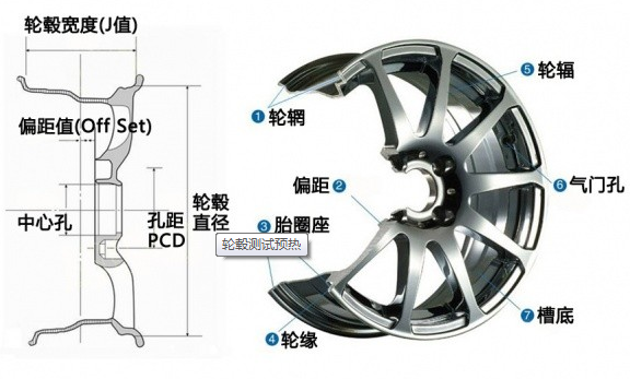 轮毂又称轮圈,是轮胎内廓支撑轮胎的圆桶形的、中心装在轴上的金属部件。参数如下图所示: