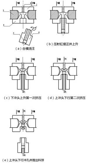 挤压铸造也称为液态模锻,是集铸造和锻造特点于一体的工艺方法——将一定量的金属液体直接浇入敞开的金属型内,通过冲头以一定的压力作用于液体金属上,使之充填、成形和结晶凝固,并在结晶过程中产生一定量的塑性变形。优点:充型平稳,金属直接在压力下结晶凝固,所以铸件不会产生气孔、缩孔和缩松等铸造缺陷,且组织致密,机械性能比低压铸造件高且投资大大低于低压铸造法。缺点:与传统锻造产品一样,需要铣削加工来完成轮辐的造型。日本已有相当部分的汽车铝轮毂采用挤压铸造工艺生产,从浇注金属液到取出铸件整个过程都由计算机来控制,自动化程度非常高。目前世界各国都把挤压铸造作为汽车铝轮毂生产的方向之一。