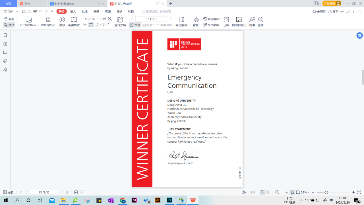代表成果:专著《物尽其用-设计方法之通用设计》、红点奖《成长童车设计》、IF《Emergency Communication》、意大利A设计奖《镜头除湿盒》等。